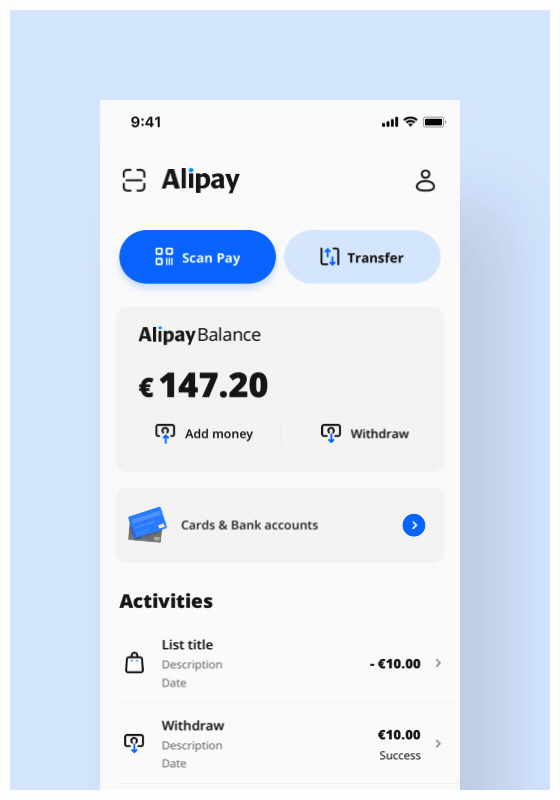 Alipay EU (European) is the continuation of our team’s international ewallet efforts. This time concentrating in the EU market. The product piggybacked off of Alibaba’s huge e-commerce platform AliExpress, leveraging its already substantial userbase and to familiarize them with the ewallet concept.